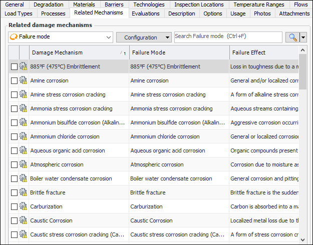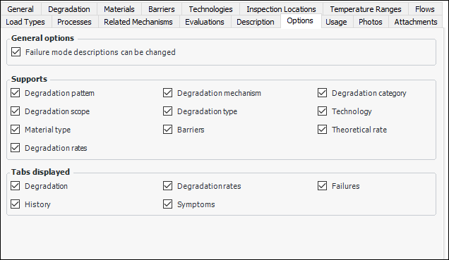 • You can select or clear options on individual tabs, and your selections are summarized on the Options tab. On this tab, you can also specify that failure mode descriptions cannot be changed in failure modes created from the entry.Steps to Add a Failure Mode to the Damage Mechanisms Library