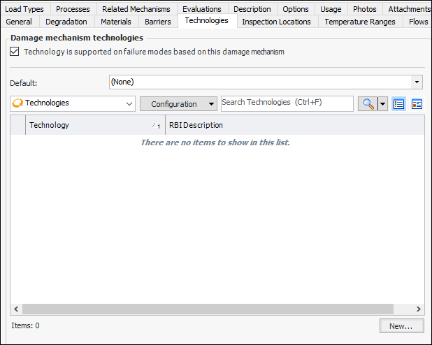 2. For each technology, click New. The Damage Mechanism Technology dialog appears.