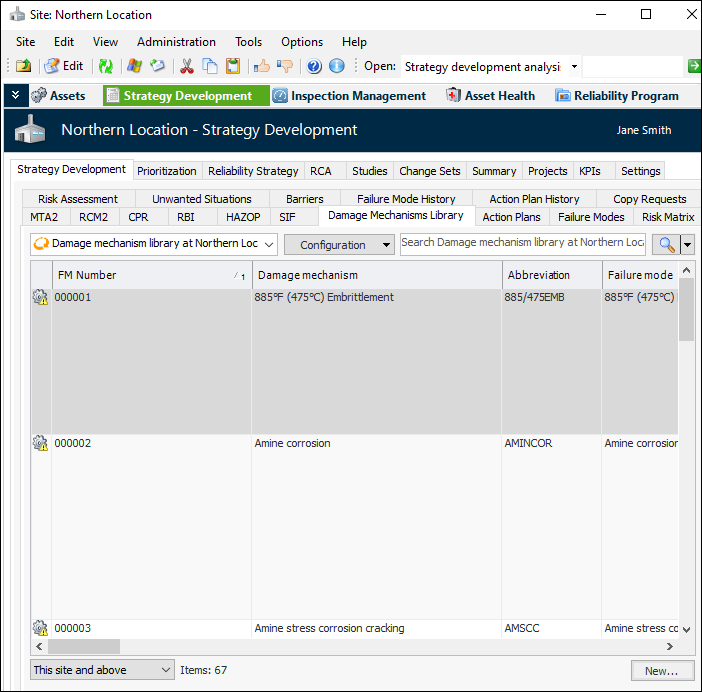 1. On the Site window, select the Strategy Development view and tab. Select the Damage Mechanisms Library tab.