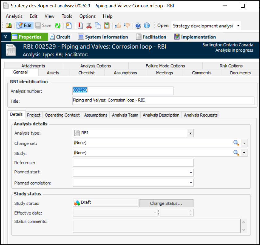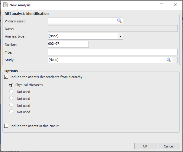 2. Click New. The New Analysis dialog appears.Tip: You can also create an RBI analysis by opening an asset and selecting the Strategy Development view and tab. Then select the Analyses tab. From the New list, select RBI. The New Analysis dialog appears, and the primary asset information is filled in.