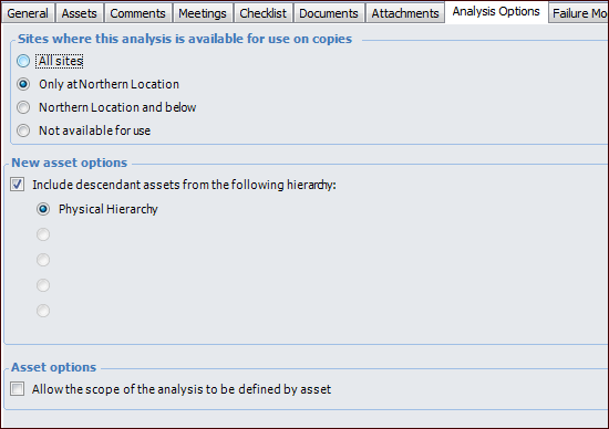 30. The New asset options area shows the settings you selected on the New Analysis dialog when creating the analysis. If you intend to add assets, you can select a different hierarchy.On the Assets tab, you can provide a description of the scope covered by the analysis. The same asset can be added to the analysis as many times as required. For more information, see Working with Asset Scope on an RBI Analysis.