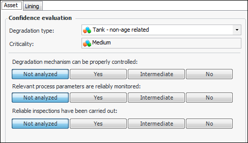 • The Confidence factor box displays the default for the degradation type. If the degradation type’s settings allow, you can select another value from the Confidence factor list.For each confidence statement, click a response, for example, No, Yes, or Intermediate. The Confidence factor box displays the result of your selection, indicating if confidence is low or high. The inspection factor, inspection interval, integrity group, and inspection strategy might also be supplied.