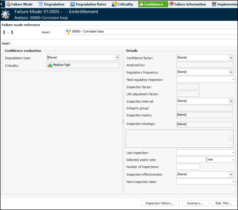 • For instructions on using the simpler evaluation with weighted severities, see Performing RBI Risk Analysis with Weighted Severities.Note: APM also provides a method of performing risk analysis on safety devices that protect equipment, people, and environments from events such as pressure build-up, fire, or equipment failure. Risk analysis is performed on one or more demand scenarios identified on the failure mode. For more information, see Performing RBI Demand Scenario Risk Analysis.Note: Before you can perform risk analysis, the severities, probabilities, confidence factors, and risk matrix entries must be set up in the site’s risk analysis settings. If you are using evaluation forms, they must also be set up. For more information, see Setting up APM for RBI Analysis.