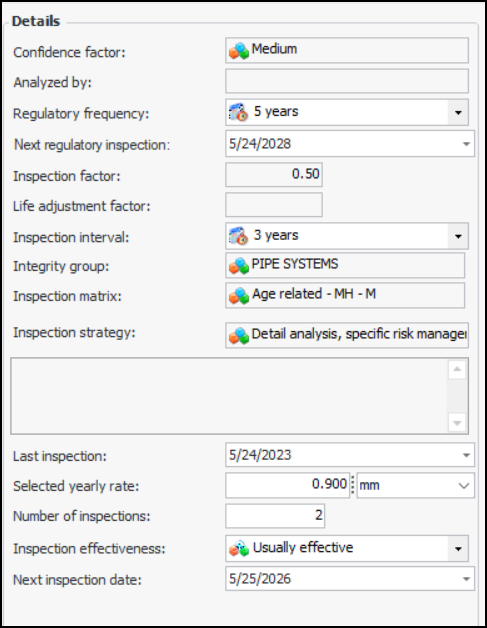 4. In the Details area, add the regulatory inspection frequency and the last inspection date. APM calculates the next regulatory inspection date, which you can change if required.Note: If you selected a degradation rate on the Degradation Rates tab, as explained in Adding Degradation Rates to RBI Failure Modes, the selected yearly rate and next inspection date are copied to the Details area. Otherwise, you can enter these values here.In this example, the confidence evaluations resulted in an inspection factor of 0.50, as shown in the Details area: