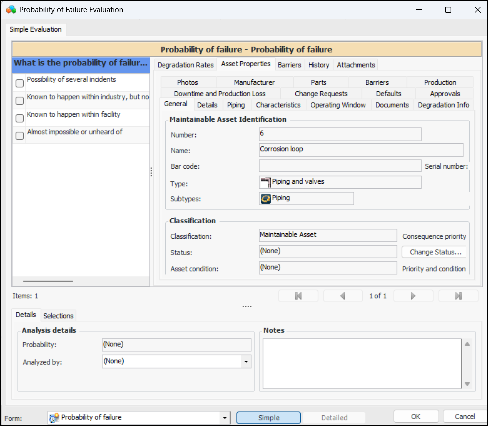 6. Complete the evaluation, selecting options for each category, entering notes, and using the arrow buttons to move between categories. If different evaluation types have been defined in the form’s design, you can select Simple or Detailed, as required by the complexity of the failure mode that you are analyzing.As you move through the analysis, the Probability box displays the most severe probability value assigned to your selections. For example, if you select options for three categories, two of which have a result of “Negligible” and one with a result of “High”, the score for the evaluation as a whole will be “High”. This will be the probability used in the risk analysis.
