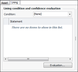 3. The Lining tab is available if the asset has lining properties and the degradation type requires a separate confidence evaluation. Select the Lining tab. You will see one or more of the following: