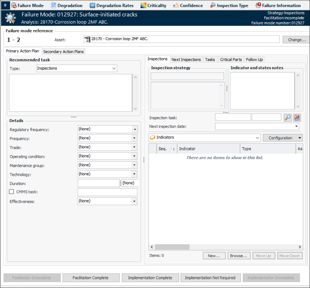 5. Select the Implementation view and the Primary Action Plan tab. The information on this tab varies depending on the recommended strategy. Here is an example for inspections:Tip: If an inspection strategy has been assigned to the failure mode, the strategy and its description are displayed on the Inspections tab.