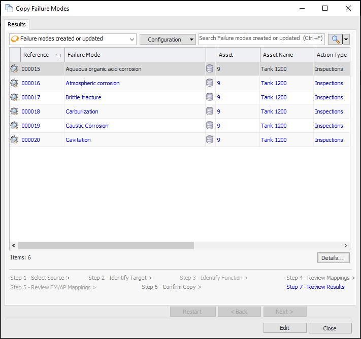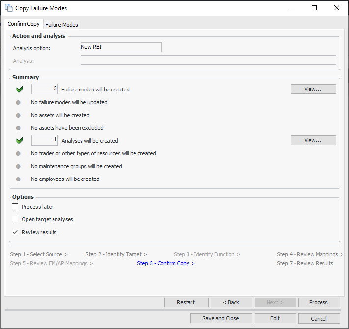 18. Check the items that will be created or updated. If an incorrect copy request is processed, you will have to make the corrections manually. Click View to see more details about the items.The Failure Modes tab shows information about the source failure modes. If you wish to remove a failure mode from the list, right-click it and click Remove. Click Back to make adjustments on previous pages.