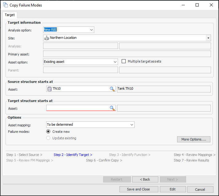 3. All of the source failure modes are selected by default. Clear any that you do not wish to copy and click Next. The Identify Target step appears. This example shows the step when the source is an analysis:If the source is a template, the Asset option box is set to “Existing asset”.