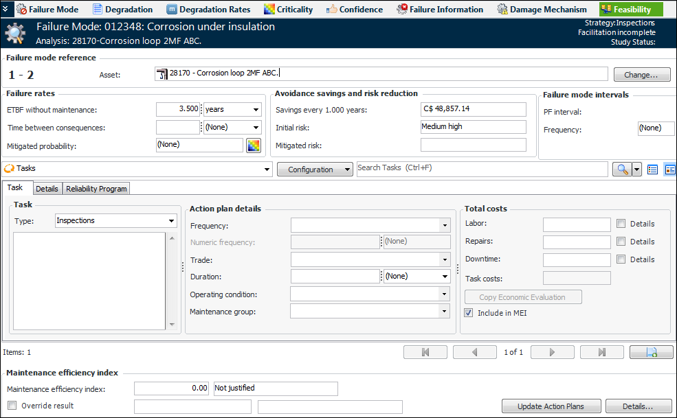 If you have performed risk analysis on the failure mode, when you select the Feasibility view, you will see that it displays the estimated time between failures (ETBF) without maintenance, avoidance savings, and initial risk. These values are based on the following:Next, enter the frequency and costs of implementing the recommended task. You can itemize the cost of labor, repairs, and downtime or lost production on additional tabs. If you performed a detailed economic evaluation, Copy Economic Evaluation becomes available when you select a maintenance task type. When you click this button, information from the Economic Effects Evaluation form is copied to the Labor, Repairs, and Downtime tabs.You can add as many tasks as needed. To compare the effect of different tasks, you can select or clear the Include in MEI setting on individual tasks. The maintenance efficiency index (MEI) value changes accordingly.When you establish that the tasks are justified, click Update Action Plans to create or refresh the action plan for the recommended task. Secondary action plans are created for any additional tasks.To Perform a Feasibility Evaluation