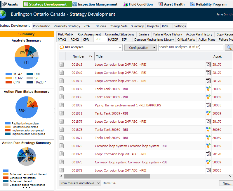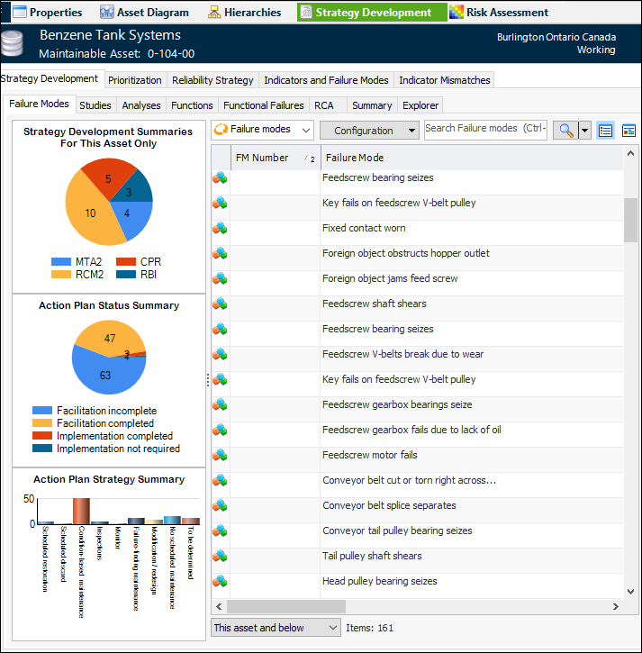 The Site window, Strategy Development view contains tabs that allow you to review all of the site’s strategy development analyses and to view failure modes for all assets. For example: