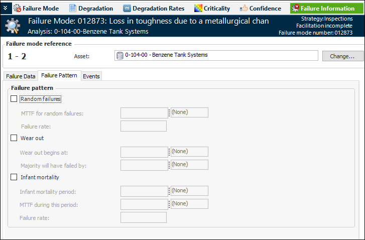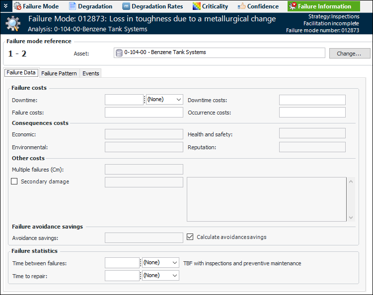 • You can manually enter costs on the Failure Information view if criticality evaluation is not performedIn the Failure Information view, the Failure Data tab displays the estimated downtime, downtime costs, downtime per occurrence costs, failure costs, cost of multiple failures, and secondary damage cost. This tab also shows the consequence costs, if supported by the analysis’ failure mode settings. The following example shows the results when the detailed economic evaluation has been performed, as well as the other consequence evaluations:When Calculate avoidance savings is selected, APM sums the following values to arrive at the savings:On the Failure Pattern tab, you can record random, wear out, and infant mortality patterns. Typically, you will include information about failure patterns when you intend to use Isograph Availability Workbench to analyze and optimize action plans.To Record Failure Data