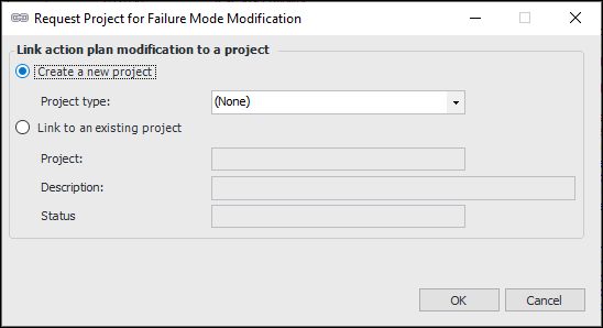 2. Right-click the failure mode in the table and click Link to Project and then Modifications. The Request Project for Failure Mode Modification dialog appears.Note: An action plan must recommend the Modification/redesign task and have the status Facilitation Completed before the Link to a Project option is available.