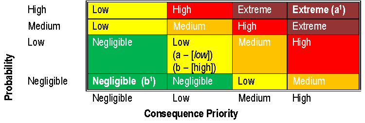The failure mode is adjusted two positions to the right on the Consequence Priority axis and two positions up on the Probability axis, resulting in an adjusted risk matrix value of Extreme (represented by a1 in the following diagram).Risk Plot Chart