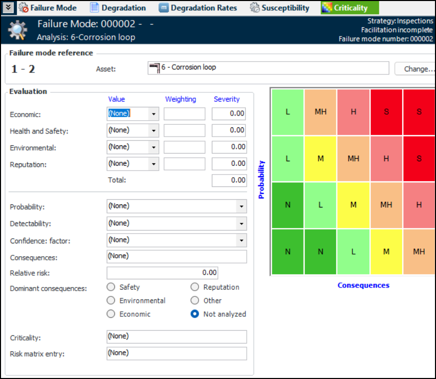 9. Select the most important consequence from the Dominant consequences options.When you have performed risk analyses for all of the failure modes in the analysis, you can compare them using the Risk Assessment view. For more information, see Viewing Risk Analyses for RBI Failure Modes.