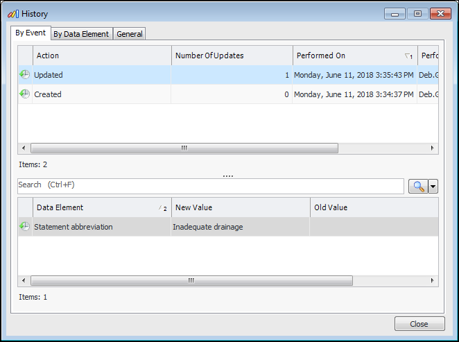 12. To see the history of an element, right-click it and click History. The History dialog shows the actions performed, old and new values, and so on. For example:
