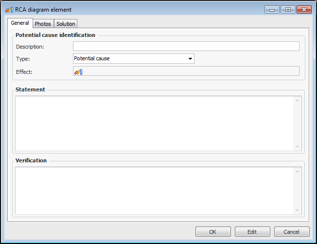 3. The Problem element displays the description from the Definition view, Problem tab. To change the problem definition, double-click the element. The RCA Diagram Element dialog appears, where you can edit the value in the Description box. The Statement box displays the problem statement that was entered in the Definition view. You can edit the statement here.Tip: Or you can right-click the problem element and click New Cause.