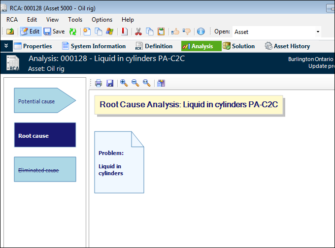 If your organization requires that root cause analyses be sent for approval, this step typically occurs before solutions are implemented. For information, see Sending an RCA for Approval.When you have identified a root cause, you can define its solution in the form of either a strategy development analysis or a request for an analysis. For information, see Creating Solutions for Root Causes.RCA Diagram