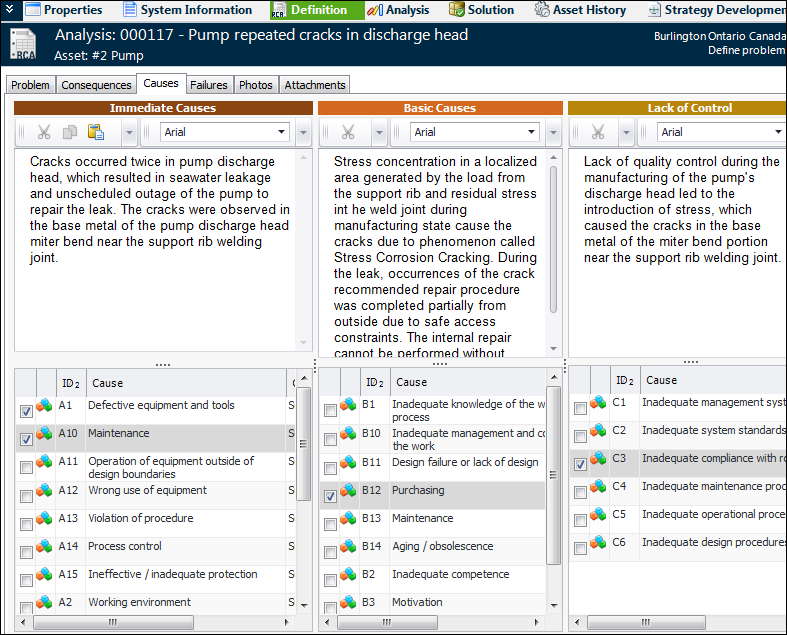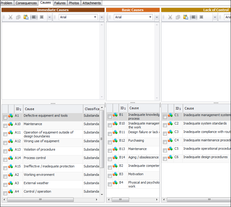 1. This tab displays text boxes for Immediate Causes, Basic Causes, and Lack of Control. Each text box supports the full range of formatting options. Below each box is a list of the classifications that have been defined for your organization. For example: