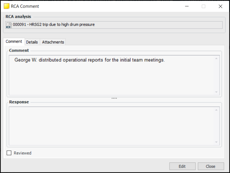 2. Click Edit to modify the comment, add a response, or mark the comment as reviewed. You can also add attachments and view details about the comment’s history.