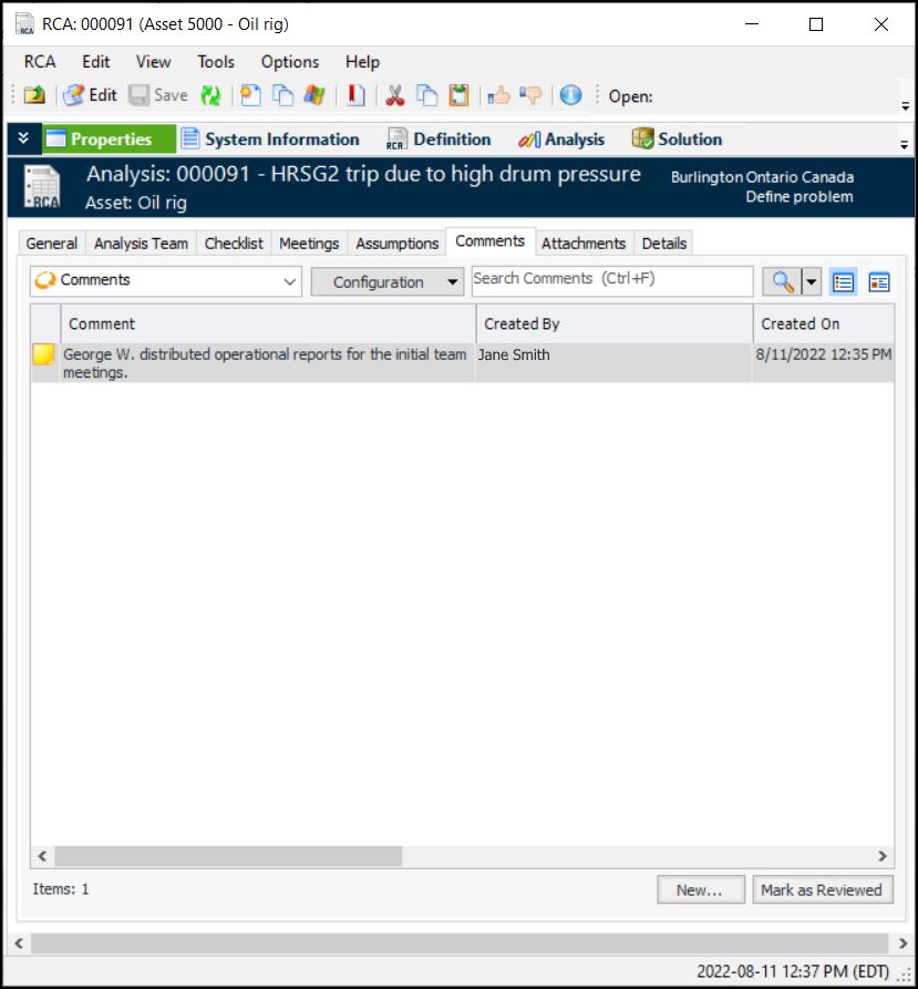 1. Open the analysis, select the Properties view, and Comments tab. This tab lists existing comments, showing who entered them and when, the responses, and their statuses.