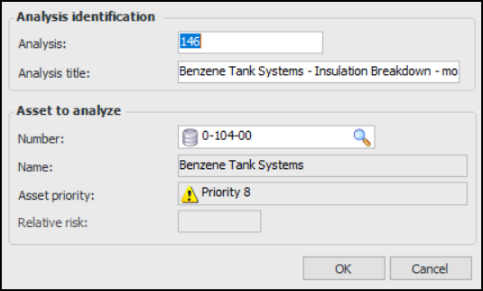 6. Identify the asset to be analyzed. Click the browse icon to select an existing asset on the site. In the Asset Selector dialog, select the Asset Listing or Asset Hierarchy tab to locate the asset. Double-click the asset to select it and close the selector dialog. The asset’s number, name, priority, and relative risk are displayed.When the asset is selected, three views are added to the window: System Information, Asset History, and Strategy Development. These views provide information about the asset, for example, its description, failures, root cause analyses, work order tasks, work requests, indicator readings, failure modes, and strategy development analyses.