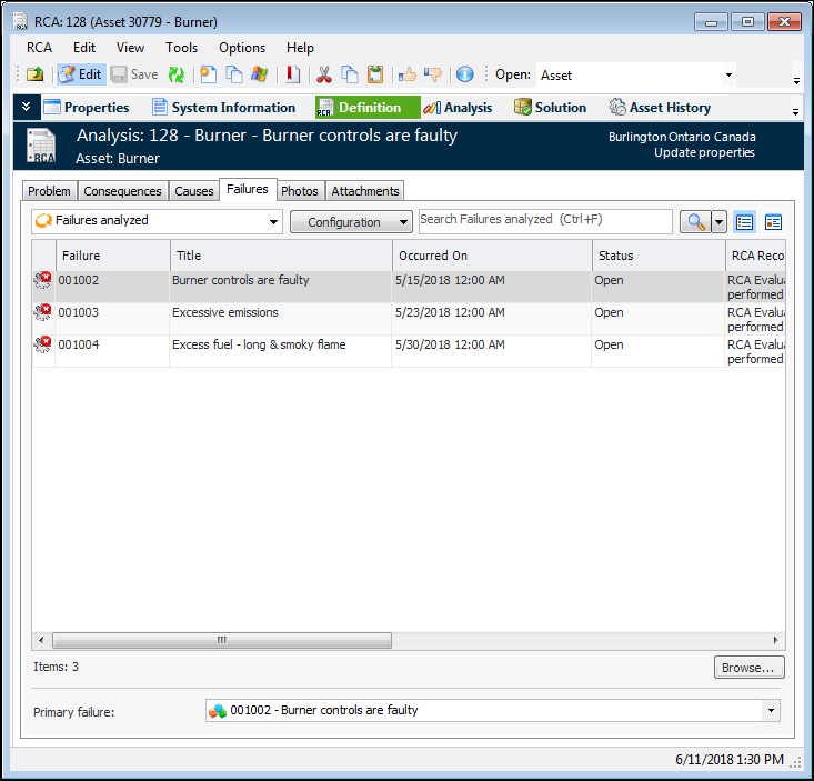 7. Select the Definition view to see information about the failure(s). The Consequences tab displays the primary failure’s evaluation.