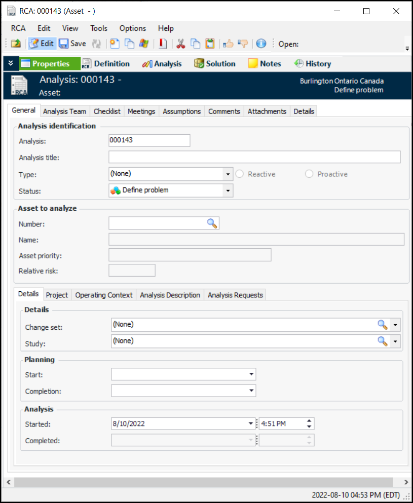 3. Select the RCA request that you wish to process, click the Selected list, and then Process Request. The RCA window appears, showing the title, asset, and planning information from the request. The Analysis Requests tab lists the request. The status of the request changes to “Processed”.To Create an RCA from Scratch