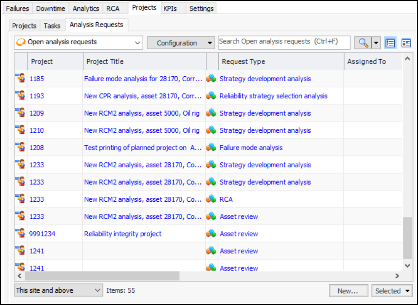 • From one or more failures – From the site’s Performance Management view, Failures tab, you can select failures and start an RCA. See To Start an RCA from One or More Failures.Tip: You can also add failures to the RCA in the Definition view.Note: You can initiate the RCA from the Failure window after evaluating the failure’s suitability for RCA. You can also create a request for an RCA to be performed in the future. See Creating an RCA from a Failure.