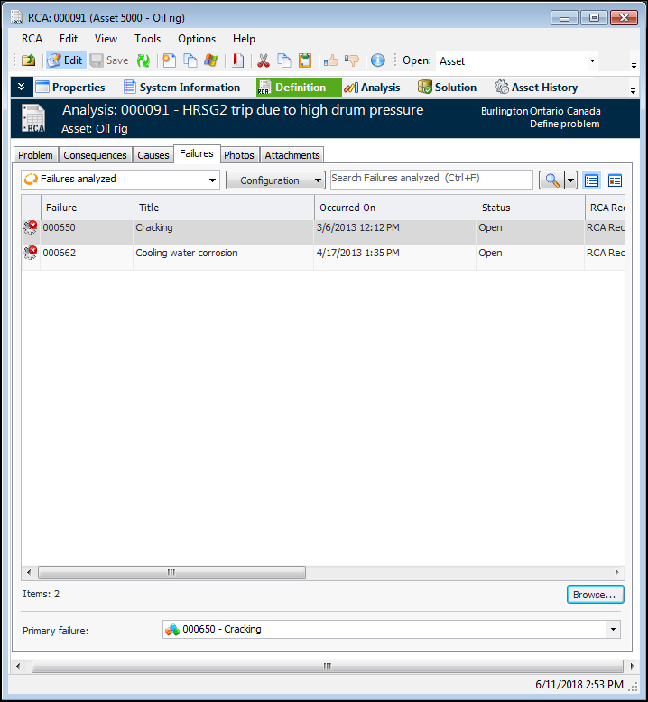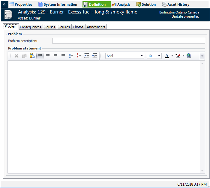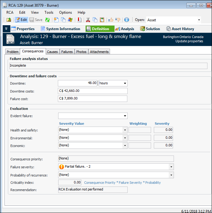 In the RCA window, the Definition view allows you to document the problem by entering a problem description and statement. You can add failures, review failure consequences, and augment the definition by attaching documents, photographs, and so on.For a reactive analysis based on one or more failure records, the Consequences tab displays the result of the RCA evaluation. The Failures tab lists the original failures. You can add related failure records and evaluate failure consequences using these tabs.Evaluating Failure Consequences