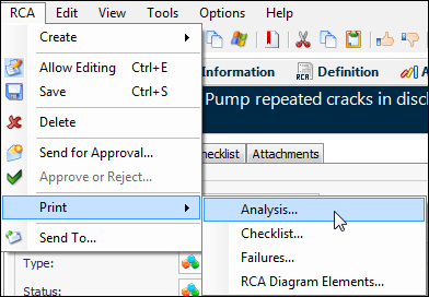 • RCA Diagram Elements – Each element in the RCA diagram, its type, cause statement, parent, status, and failure mode.To Print Reports About an Analysis