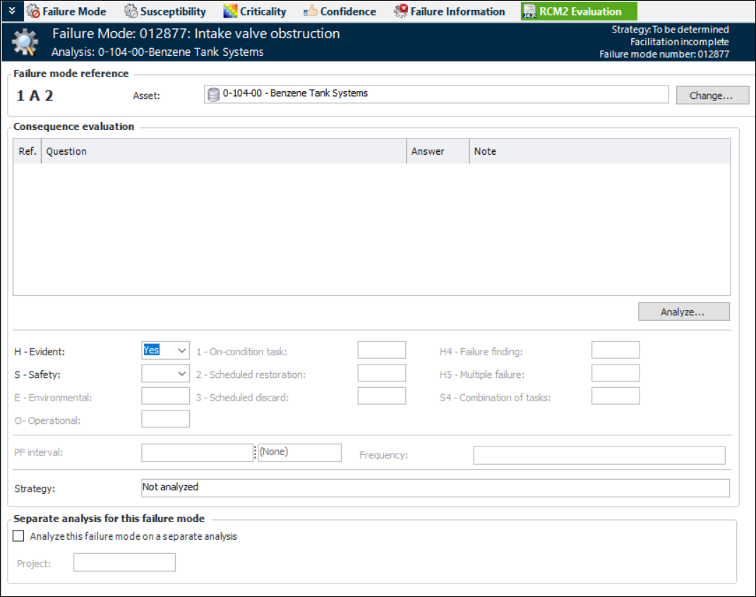 2. Note: To analyze the failure mode in another RCM2 analysis, keep pressing Tab until the Analyze separately option is available (the last column on the right). Click the check box. The task type changes to “To be analyzed separately”. The failure mode remains in the current analysis, but you cannot develop it further.