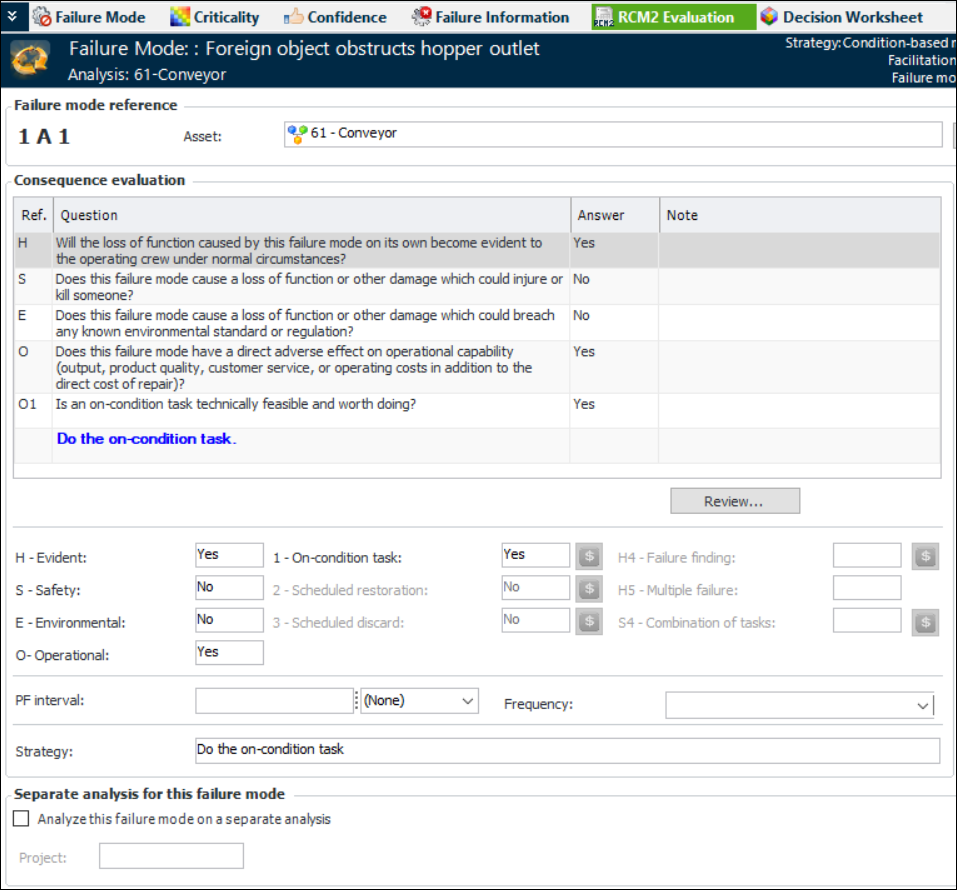 10. To revise the evaluation, click Review. The RCM2 Failure Mode Decision Logic window appears, where you can go through the questions and revise them as needed.To Manually Record a Failure Mode Evaluation
