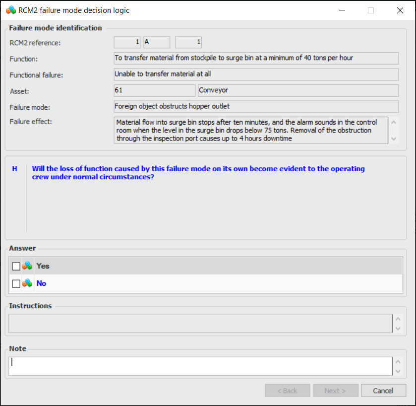 8. Click Next. The question that appears follows from the answer to the previous question. Continue to answer questions and click Next until the recommended strategy is displayed.Tip: To revise an answer, click Back to return to it. Revise your answer and continue through the questions by clicking Next.Note: If your analysis takes you to question H4, “Is a scheduled failure-finding task technically feasible and worth doing?”, you can calculate the failure-finding interval before deciding on the answer. Click FFI and see Calculating a Failure-Finding Interval for an RCM2 Analysis for more information.