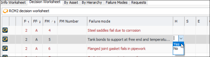 2. In the H-Evident list, select Yes or No. A hidden failure does not become apparent to the operating crew under normal circumstances if the failure mode occurs on its own. The next option becomes available depending on whether the failure is evident or hidden.