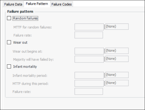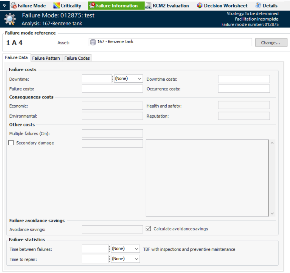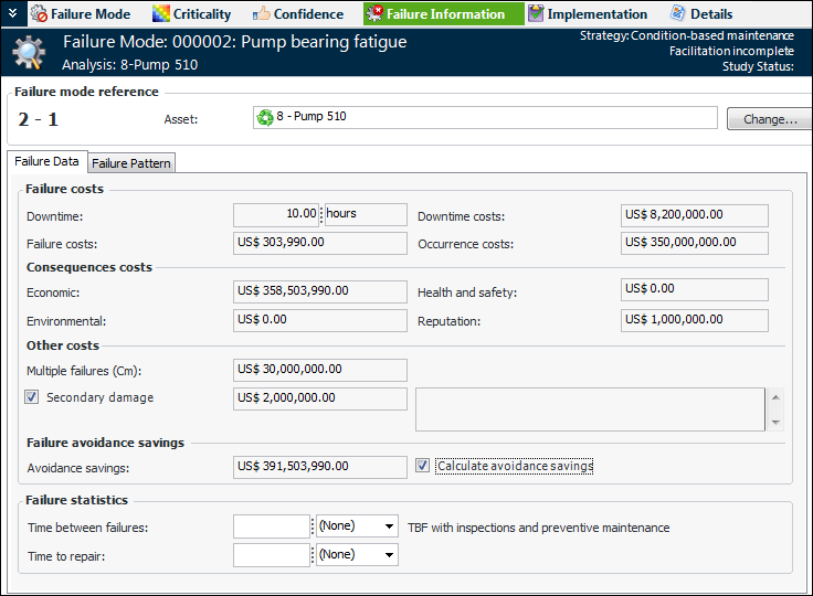 • You can manually enter costs on the Failure Information view if criticality evaluation is not performedIn the Failure Information view, the Failure Data tab displays the estimated downtime, downtime costs, downtime per occurrence costs, failure costs, cost of multiple failures, and secondary damage cost. This tab also shows the consequence costs, if supported by the analysis’ failure mode settings. The following example shows the results when the detailed economic evaluation has been performed, as well as the other consequence evaluations:When Calculate avoidance savings is selected, APM sums the following values to arrive at the savings:On the Failure Pattern tab, you can record random, wear out, and infant mortality patterns. Typically, you will include information about failure patterns when you intend to use Isograph Availability Workbench to analyze and optimize action plans.To Record Failure Data