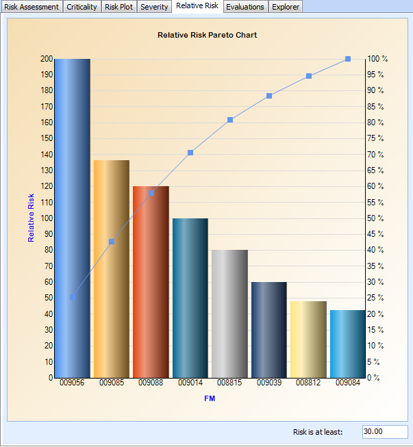 These tabs display Pareto charts for the values. Here is an example of the Relative Risk tab:Evaluations