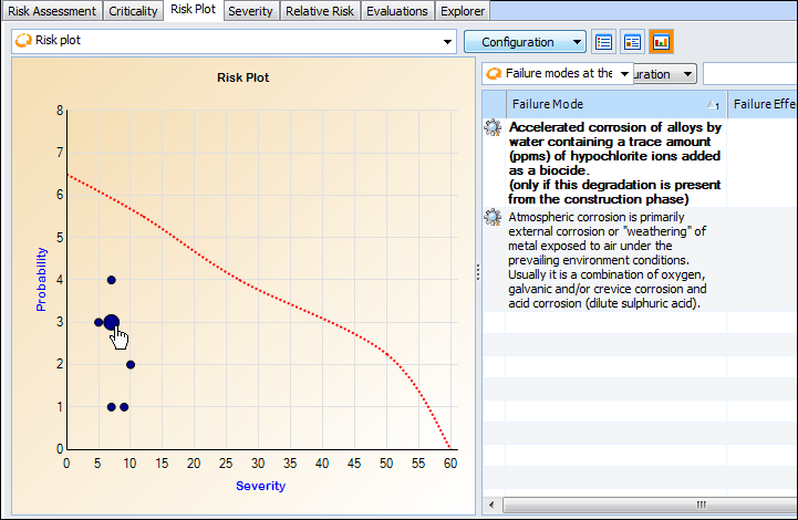 After you have assessed the failure modes in an analysis, you can compare failure modes and identify the relative importance of addressing them. The Risk Assessment view in the Strategy Development Analysis window includes charts based on severity and relative risk, a risk plot, risk matrix, and summaries. This view is also available for the asset.Tip: You can also view risk assessments and risk matrix information for all failure modes on the site. On the Site window, select the Strategy Development view and tab, and then the Risk Assessment tab. To view an asset’s information, open the Asset window, and select the Risk Assessment view.The tabs on the Risk Assessment view provide the following information.Risk Assessment