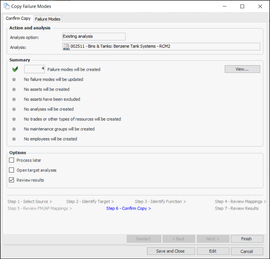 18. Review the items that will be created or updated. If an incorrect copy request is processed, you will have to make the corrections manually. Click View to see more details about the items.The Failure Modes tab shows information about the source failure modes. If you wish to remove a failure mode from the list, right-click it and click Remove. Click Back to make adjustments on previous pages.