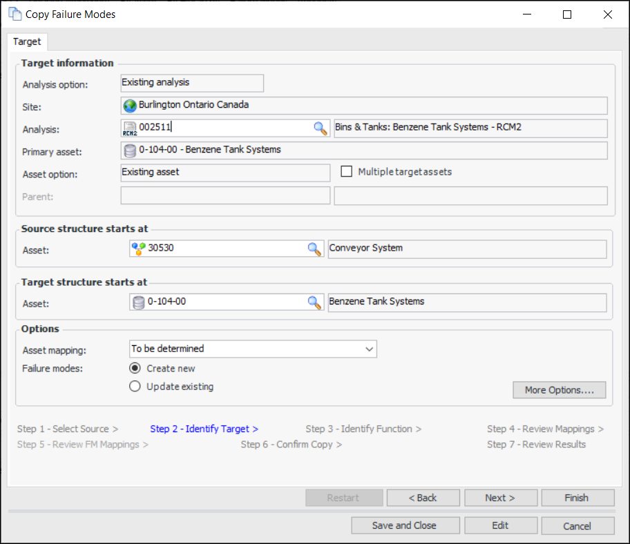 • Copy the source failure modes’ function and functional failure – copies of the function and functional failure are created in the target analysis when the copy request is processed