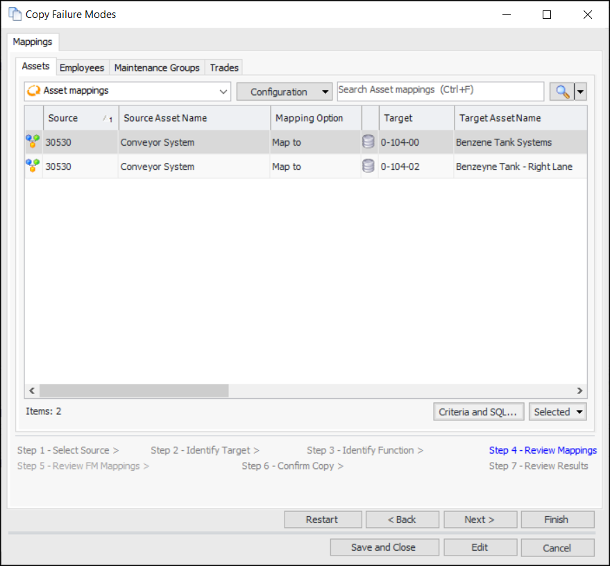 • To Be Determined – you can select the mapping option laterFor employees, trades, and maintenance groups, the Mark as options are New, Same As Source, and To Be Determined.Note: If a mapping is marked as To be determined, the copy request cannot be processed. However, you can save and close it until you decide what to do with it. You can then re-open the request from a Copy Requests tab and finish defining and processing it. For more information, see Revisiting RCM2 Failure Mode Copy Requests.