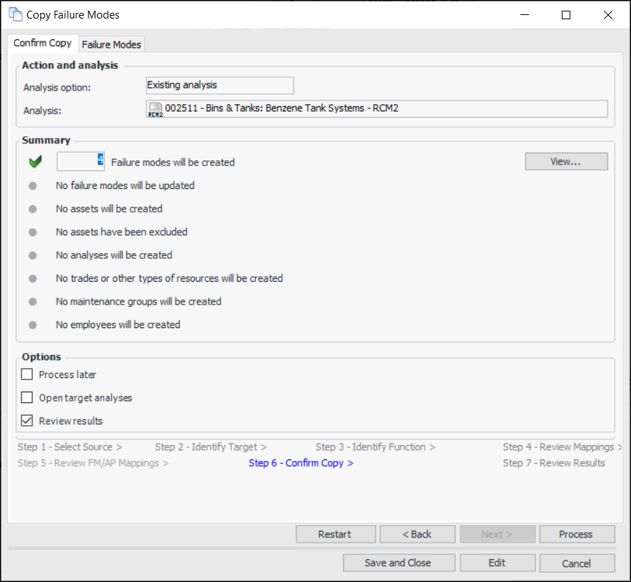 19. Review the items that will be created or updated. If an incorrect copy request is processed, you will have to make the corrections manually. Click View to see more details about the items.The Failure Modes tab shows information about the source failure modes. If you wish to remove a failure mode from the list, right-click it and click Remove. Click Back to make adjustments on previous pages.