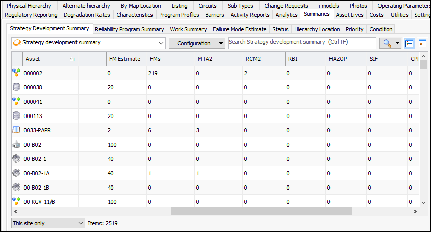 1. The Strategy Development Summary tab lists the assets, counts of their failure modes, and counts of their MTA2, RCM2, RBI, HAZOP, SIF, CPR, RCA, and RSS analyses.
