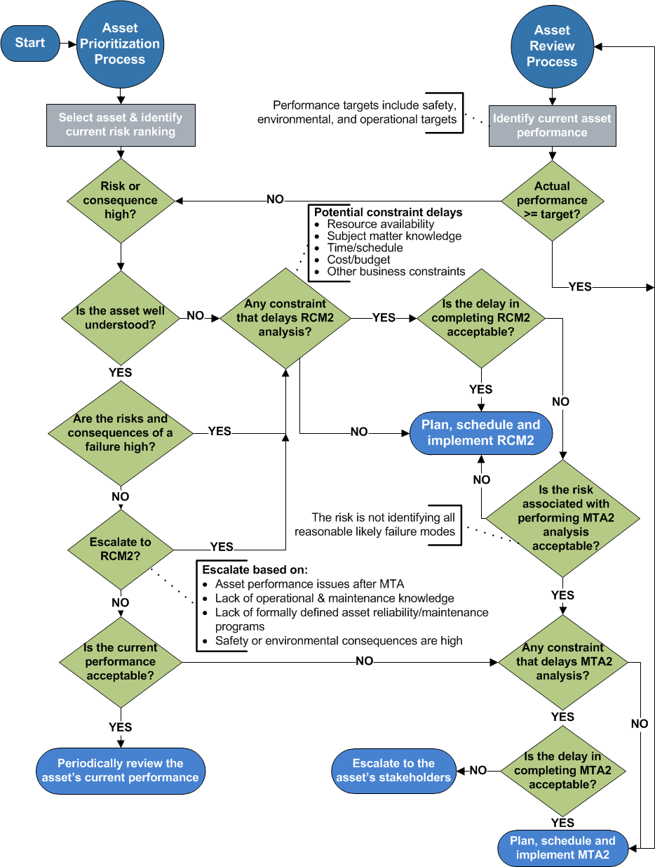 Concepts Tasks Settings Overview of Reliability Strategy Selection Reliability strategy selection (RSS) analysis applies a set of criteria to an asset to determine the most appropriate plan for improving its reliability. The analysis team uses the Reliability Strategy Selection questionnaire to perform, document, and review analyses of system-level assets. Possible strategies are to implement (or continue) basic care, perform maintenance task analysis, perform RCM2 analysis, or escalate the asset risk to stakeholders for further consideration and action. Strategy Selection in the Asset Reliability Process Reliability strategy selection is a component of the larger process of identifying and prioritizing asset improvement projects. The steps in this process are: 1. Define the asset hierarchy, which should be developed to the system level, at least, before you perform RSS analysis. 2. Perform asset prioritization analyses, which determine the assets’ relative risk and priority numbers. Whether performed using APM or by a third-party, the analysis determines the asset’s consequence priority: a value that describes the relative potential impact of an asset’s failure on the business goals of a company. This ranking allows you to identify and focus on those assets with the highest priority. The analysis also identifies the asset’s relative risk: a number that indicates the balance between the seriousness of failure consequences and the probability that failure will occur. For both the consequence priority and the relative risk, management must define thresholds for tolerability. Scores below the thresholds are considered tolerable. 3. Select the best reliability strategy for each asset, using its relative risk and consequence priority and the thresholds. Possible strategies are to implement (or continue) basic care, perform a maintenance task analysis, perform an RCM2 analysis, or escalate the asset risk to stakeholders. 4. Analyze risk versus effort to prioritize the strategies. The result is a list of reliability improvement projects sorted by relative importance. 5. Perform strategy development analysis, such as MTA2 or RCM2, for each asset that requires it. The Strategy Selection Process Reliability strategy selection starts with the list of assets sorted by relative risk, effort, and cost. Then select an asset and review the following: • Risk of failure and consequence severity • Operational and maintenance knowledge • Asset reliability program definition • Performance targets The following flowchart shows the decision logic used in the reliability strategy selection process. The outcome of the analysis is a list of assets that have been assigned appropriate reliability improvement strategies. APM provides an online questionnaire for performing strategy selection analyses. Using the asset’s consequence priority and relative risk, you can answer prompted questions to determine the recommended strategy. You can record information about the team members and notes about each decision. Team members can review the decisions and revise them if necessary. You can also print a report that lists the assets and their reliability strategies.