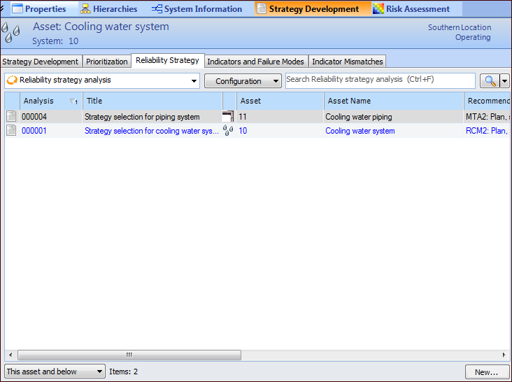• On the Asset window, Strategy Development view, Reliability Strategy tab, you can view the reliability strategy analyses performed on the asset, including the recommended strategies and their statuses. For example:You can also click New to create an RSS analysis.