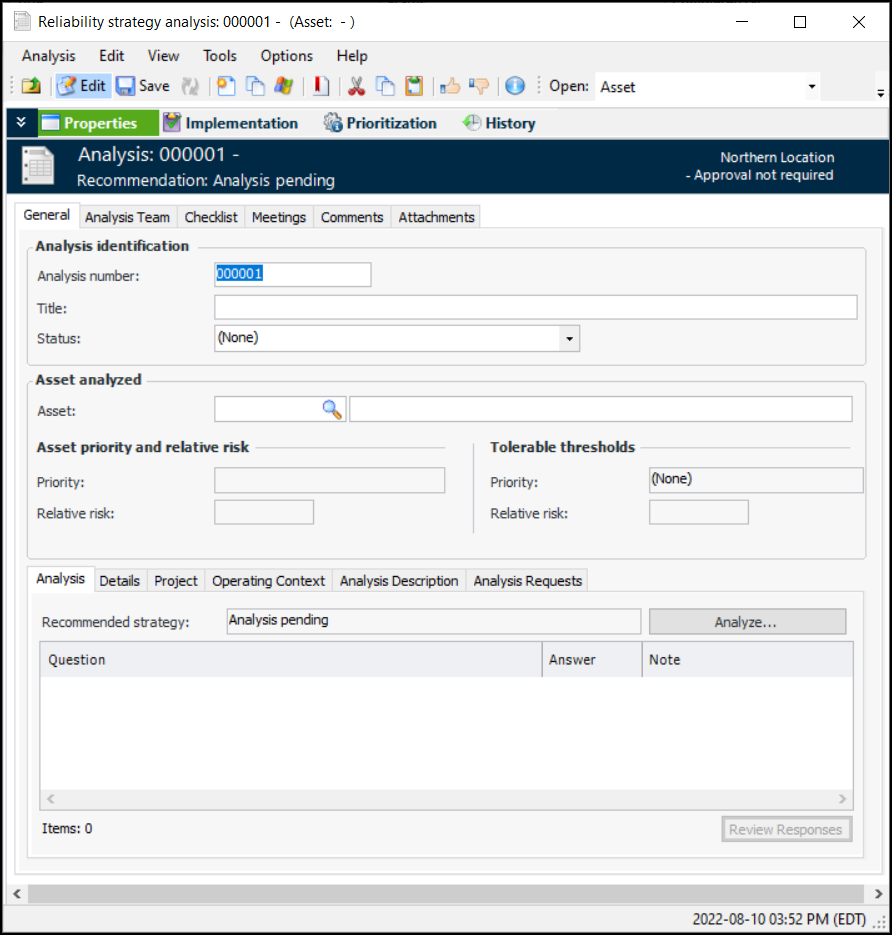 2. Click New. The Reliability Strategy Analysis window appears.Tip: You can also create an RSS analysis from the asset. In the Asset window, select the Strategy Development view, Reliability Strategy tab. Click New. The Reliability Strategy Analysis window shows the asset information.Note: When the asset is selected, views are added to the window. The System Information, Prioritization, Strategy Development, Reliability Program, and Asset History views provide information about the asset, for example, its failures, work order tasks, work requests, and indicator readings.