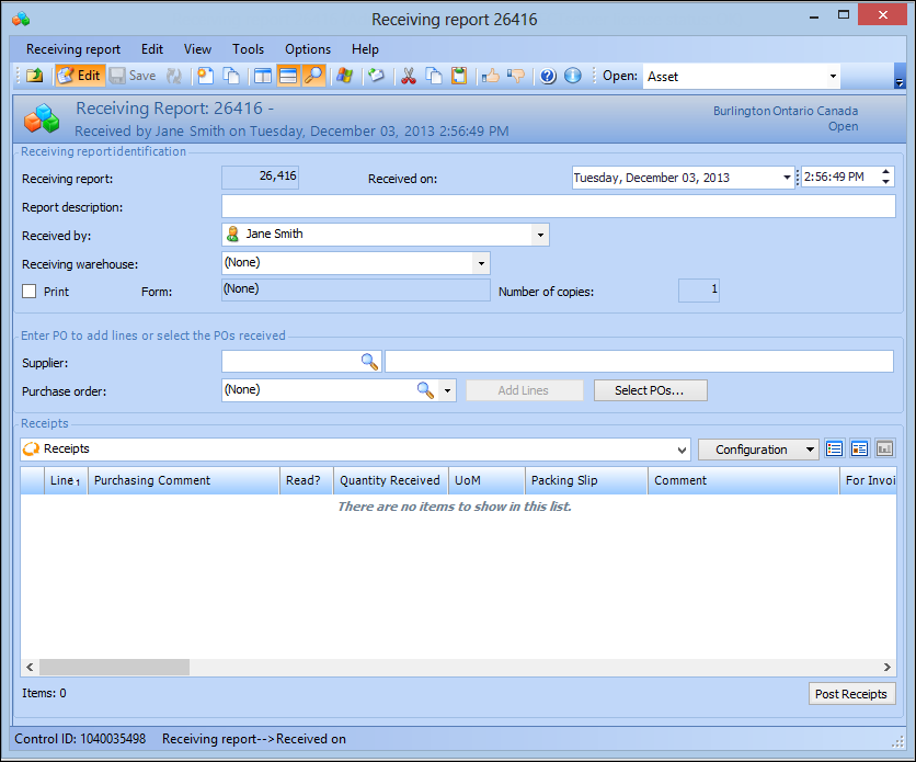 • From a warehouse, select the Tools menu and then Receive Purchase Orders. The Receiving Report window appears.