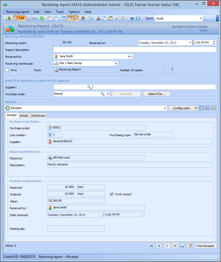 • From the site, select the Tools menu, New, then Resource Management, and then Receiving Report. The Receiving Report window appears.