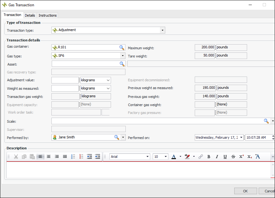 3. In the Transaction type list, select “Adjustment”.Note: If the transaction type requires you to read instructions before proceeding, the instructions are displayed. Click Acknowledge Instructions when you have read them.The Transaction tab appears with changes based on the transaction type’s requirements. For example:Note: Be sure to select the Instructions tab (even if you were not required to acknowledge instructions) before you complete the transaction.The default gas type on the container is automatically selected in the Gas type box. The maximum and tare weights are copied from the container record.