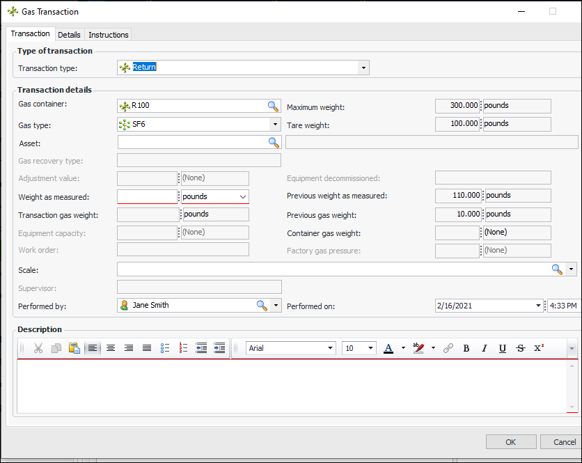 6. The Performed on and Performed by boxes are populated automatically. You can change the values if required.Note: If the performed-on date is prior to the container’s most recent transaction, Transaction gas weight is replaced by the message “Calculation pending”. When you click OK to save the transaction, the transaction gas weight is calculated and the transaction tables and windows are updated. This allows APM to ensure that the most recent performed-on date is taken into consideration.Tip: If you wish to confirm gas transaction weights, select one or more transactions in any tab under the Transactions tab. Right-click and click Calculate Transaction Quantity.